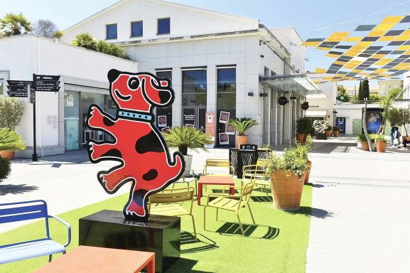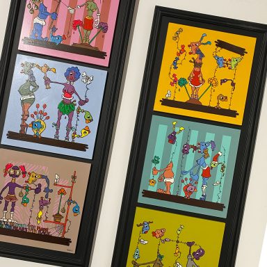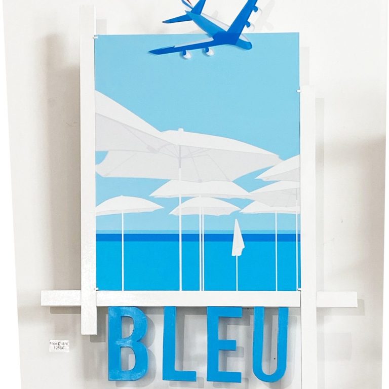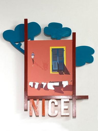 De retour d’une année en résidence d’artiste en Tunisie où il a développé l’art de la performance interactive et du dessin à la craie au sol, Olivier Derveloy a réalisé cette série d’œuvres dédiés à la Côte d’Azur et plus spécifiquement Nice et la ville de Valbonne. On y reconnait un maire ceint de son écharpe, un couple de boulangers, ou encore un chef toqué sur la place des Arcades… On se promène avec délectation dans ces toiles exubérantes où les personnages volent comme chez Chagall, la montre molle de Dali fait escale promenade des Anglais, les baigneurs ont le corps rose et le contour affirmé d’un Fernand Léger… autant de références que l’artiste qui rêve de retrouver son âme d’enfant, aime convoquer au fil de son œuvre.