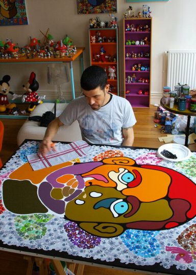 Son univers artistique est profondément influencé par le pop-art, les mangas, le street-art. Il utilise principalement des feutres et des bombes de peinture sur différents supports.