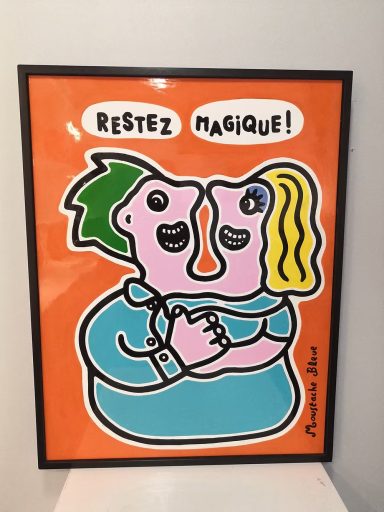 Quand on lui demande à quel courant artistique se réfèrent ses grandes toiles où caracolent les personnages de son univers, Olivier Derveloy alias Moustache Bleue répond par une pirouette : « au mouvement EDS, Envie de s’amuser, ou encore à l’AD, amusement Délirant ! » Plus sérieusement, l’artiste diplômé d’architecture tombé dans un pot de peinture il y a une vingtaine d’années pour n’en plus ressortir, s’explique : « Ce qui m’intéresse c’est de représenter le monde dans lequel je vis, en jouant sur les effets d’échelle et en le rendant gai, joyeux, fou. Un monde impossible quoi ! »